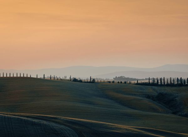 Bagliore arancione durante il tramonto su un paesaggio italiano. Abbinate questa carta da parati fotografica alla vostra casa per creare ancora più atmosfera.