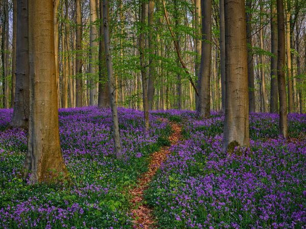 Bellissimo sentiero nel bosco circondato da giacinti di bosco. I bellissimi fiori viola spiccano immediatamente in questa foresta.