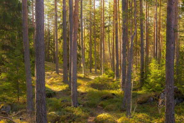 Una foresta in estate con alberi sottili in Finlandia.
