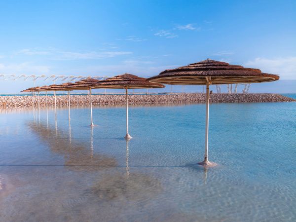 Mare calmo in una bella giornata di sole d'estate. Ci sono ombrelloni in acqua.