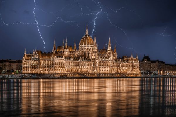Under the Storm su sfondo fotografico. Un castello splendidamente illuminato durante un temporale con fulmini nel cielo.