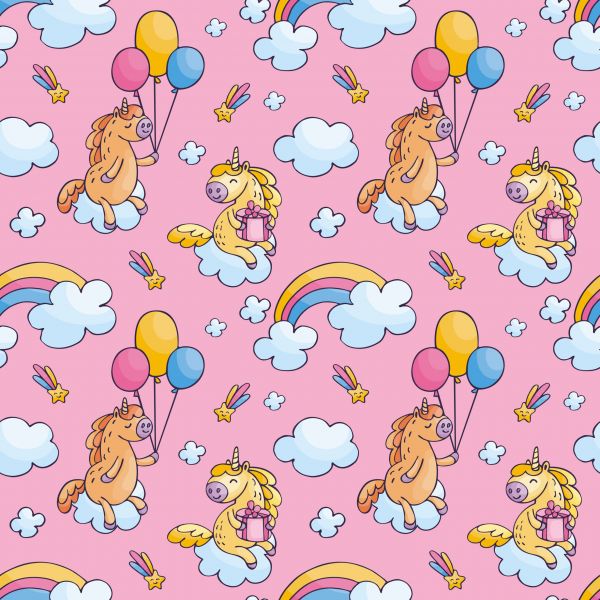Carta da parati con unicorni, palloncini e arcobaleni. Applicatela alla parete della camera dei bambini.