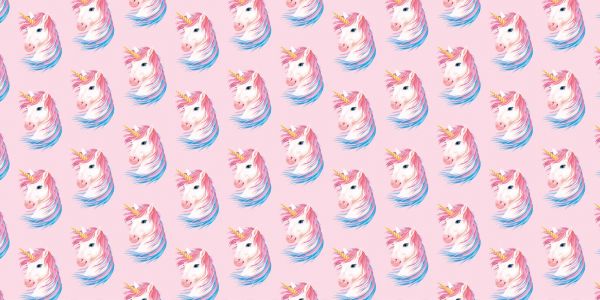 Un motivo di unicorni bianchi con corna dorate su uno sfondo rosa chiaro.