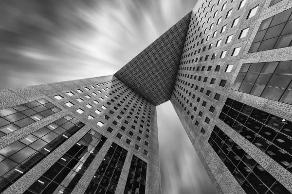 Up There è un edificio fotografato dal basso in bianco e nero. Poiché la vista è dal basso, si crea più profondità nella stanza.