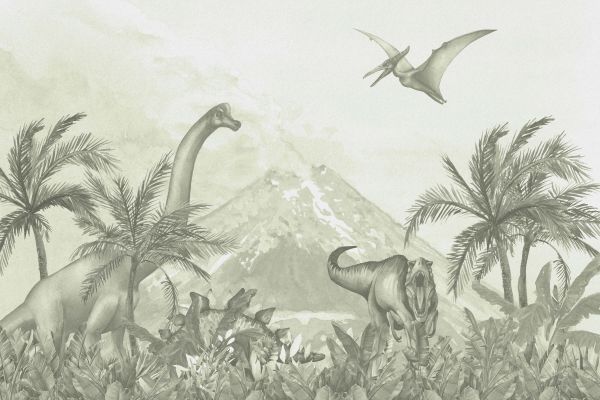 Una bella immagine con diversi dinosauri e un vulcano sullo sfondo di colore verde.