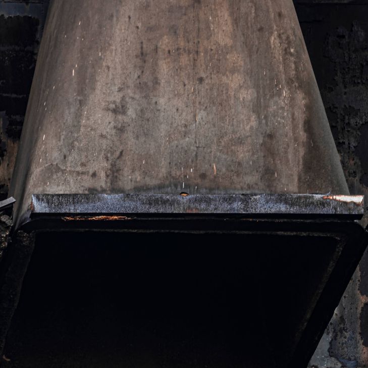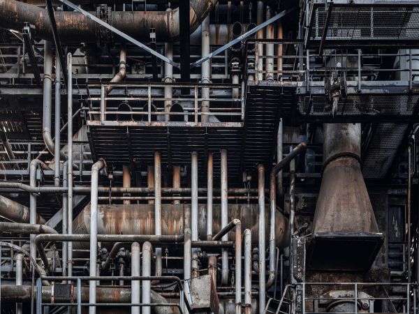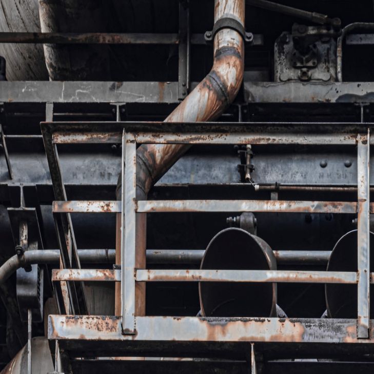Fabbrica industriale vecchia e abbandonata con elementi arrugginiti.