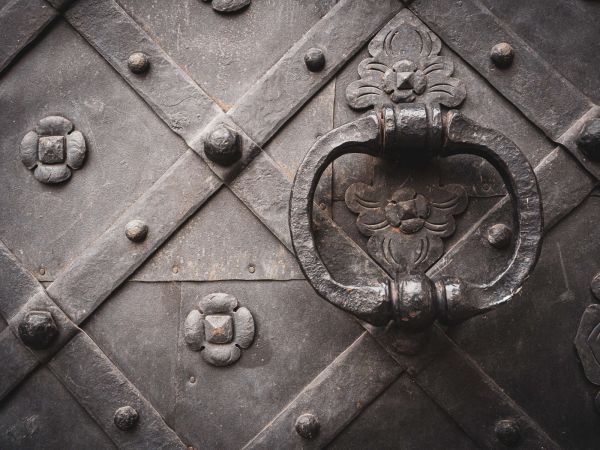 Primo piano di una vecchia porta di un castello d'acciaio con una grande maniglia.