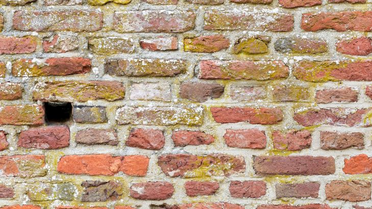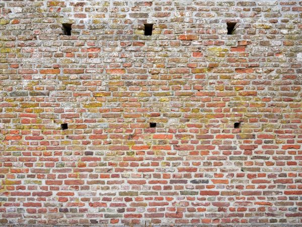 Mura di cinta in pietra con diverse tonalità di colore e buchi scuri