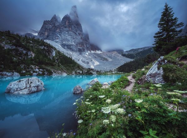 Veneto - Lago di Sorapis Panorama su carta da parati. Un lago azzurro e limpido tra le montagne con le nuvole.
