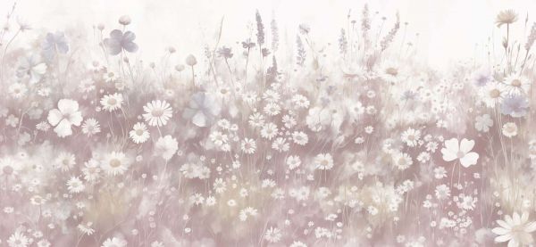 Un prato fiorito romantico in toni di rosa tenui con sottili accenti bianchi. Gli effetti acquerello conferiscono un aspetto morbido e sognante, perfetto per un interno raffinato e suggestivo.