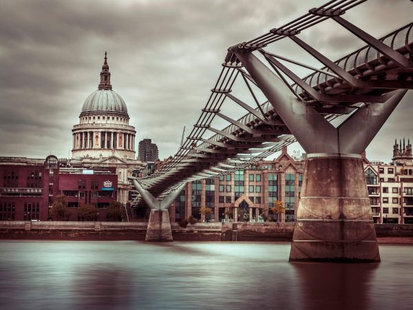Acciaio e pietra si incontrano in questo paesaggio urbano dove il Millennium Bridge segna il progresso che porta alla Cattedrale di St Paul, icona di resilienza e tradizione. I toni freddi e le linee pulite formano una transizione armoniosa tra il presente e il passato.