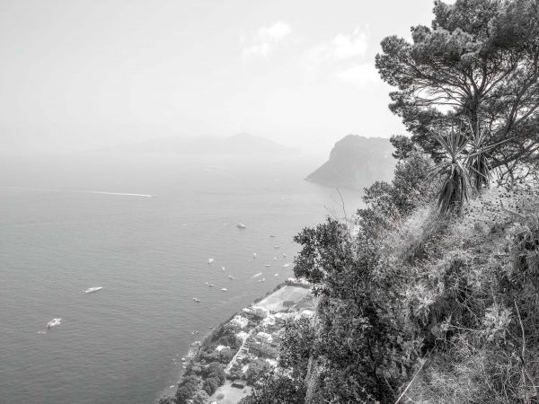 La vista da un punto dell'isola di Capri. La foto è in bianco e nero.