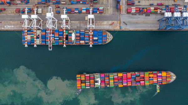 Bella vista dall'alto di due navi portacontainer nel porto.