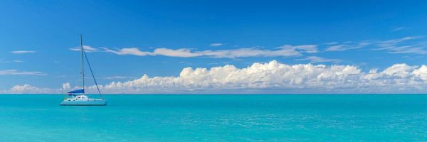 Una barca a vela bianca galleggia tranquillamente su un mare turchese cristallino sotto un cielo blu intenso pieno di nuvole cumuliformi. L'immagine trasmette libertà, leggerezza e pace tropicale.