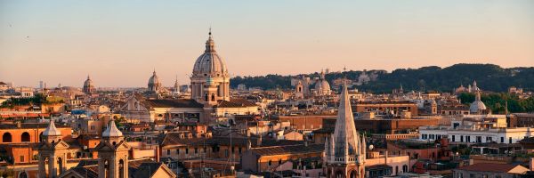 Roma Vista sui tetti durante l'alba. Al sorgere del sole, il cielo è meravigliosamente colorato.