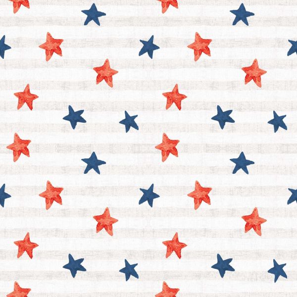 Motivo giocoso di stelle rosse e blu alternate in stile acquerello su uno sfondo con sottili strisce grigie. Il design emana allegria e ritmo.