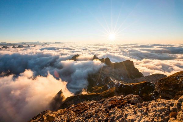 Un sole splendente sorge sopra un ondeggiante mare di nuvole in cui emergono delicatamente picchi montuosi affilati. La calda luce del sole contrasta magnificamente con le fresche ombre tra le nuvole e le rocce, creando una vista celestiale mozzafiato.
